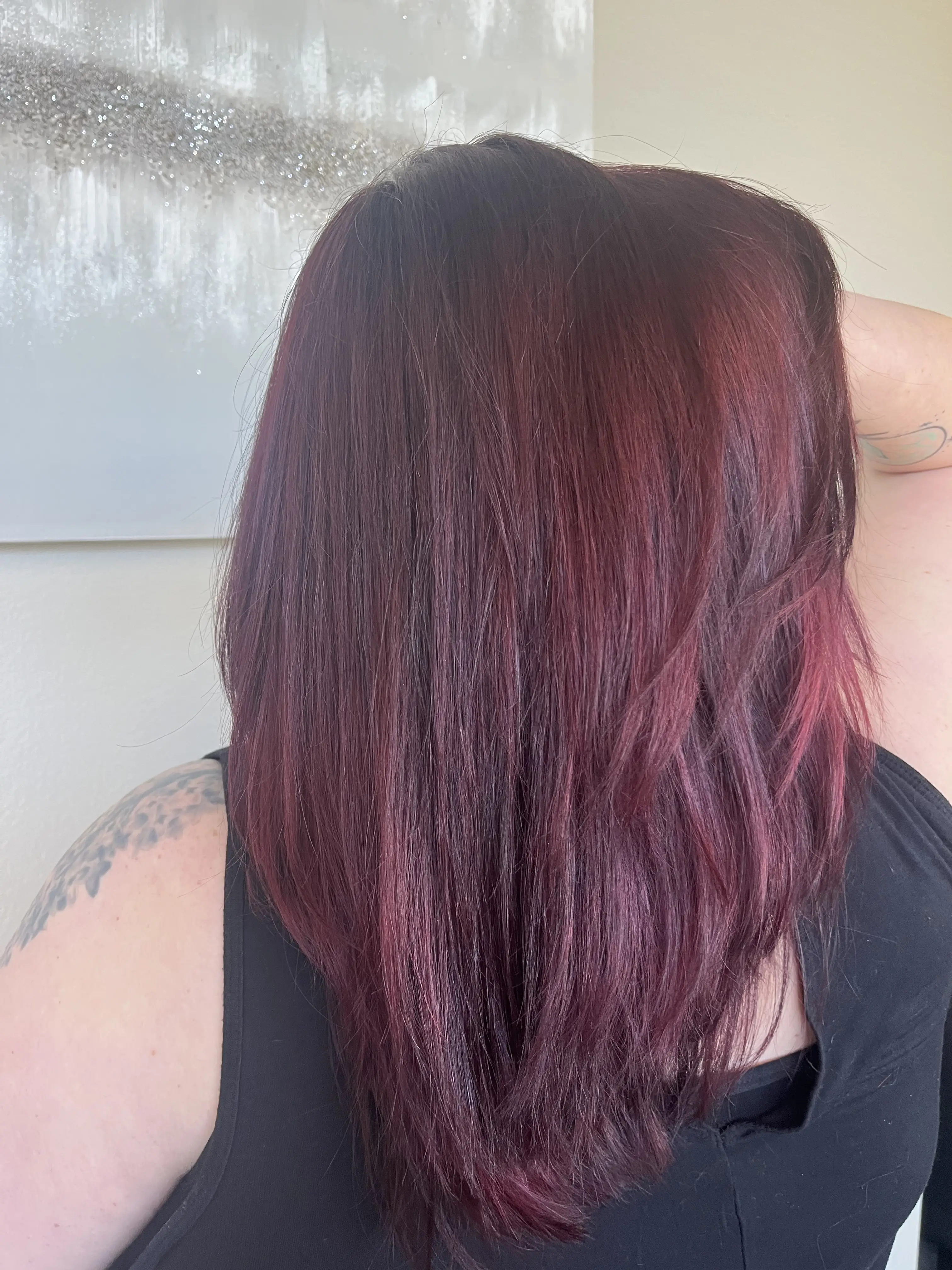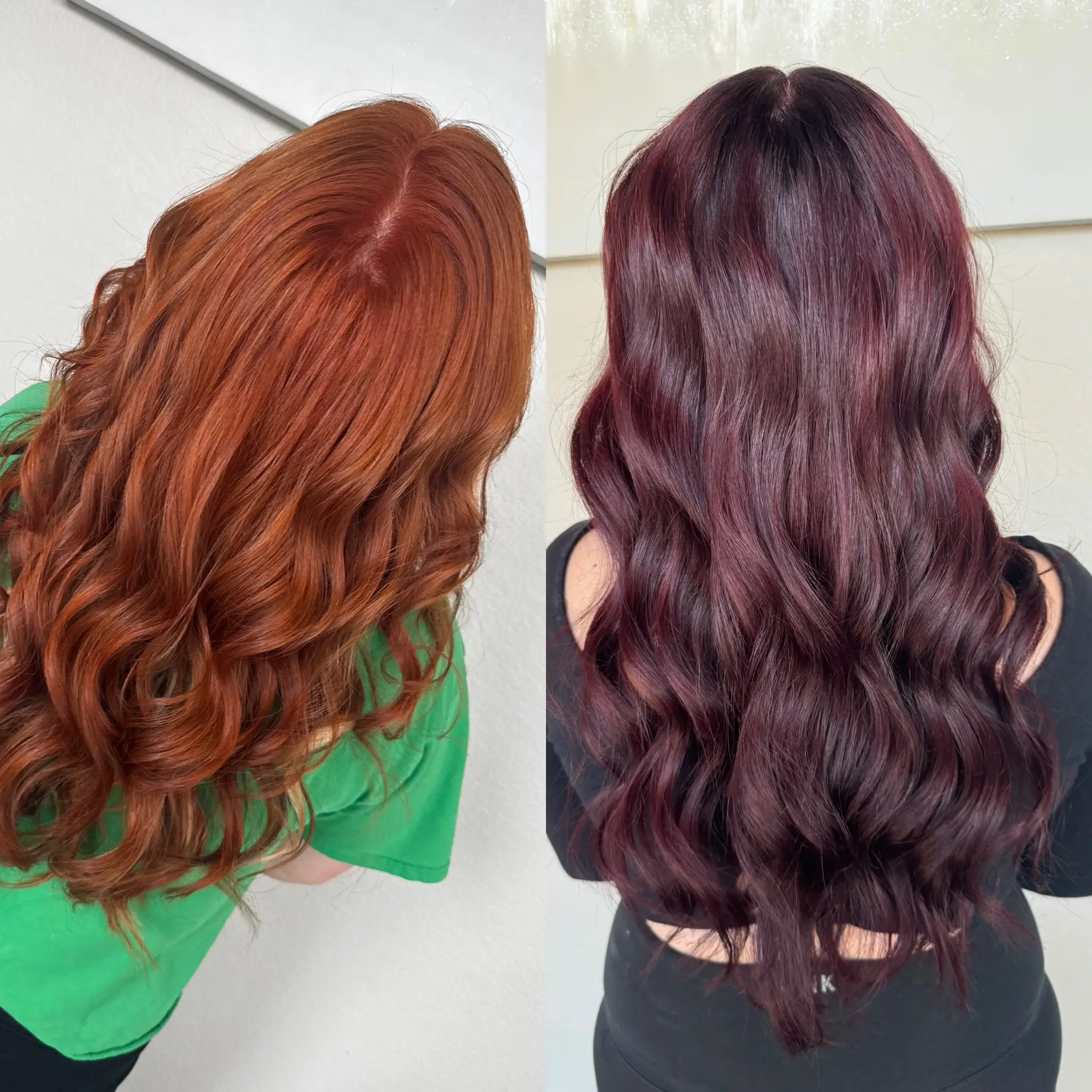 Turn heads with intoxicating custom blends of reds and copper hues. These shades are tailored to your palate, whether you want witchy ruby red or shimmering copper. Let your hair radiate unapologetic attitude with hues as unforgettable as a moonlit spell. Unleash your inner icon—vivid, volatile, and oh-so vibrant.